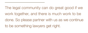 The legal community can do great good if we work together, and there is much work to be done. So please partner with us as we continue to be something lawyers get right.