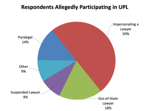 Practice Areas. Allegations of the unauthorized practice of law encompass various areas of law. In previous years, most unauthorized practice of law complaints involved non-lawyers or paralegals handling family law matters. However, in 2024 and 2025, UPL complaints involving litigation matters exceeded the other categories.