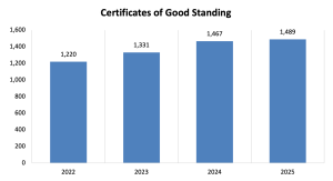 Certificates of Good Standing. In 2025, the Office of the General Counsel prepared 1,489 Certificates of Good Standing/Disciplinary History at the request of Oklahoma Bar Association members.