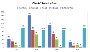 In years when the approved amount exceeds the appropriated amount, the amount approved for each claimant will be reduced in proportion on a pro rata basis until the total amount paid for all claims in that year is $175,000.00. The Office of the General Counsel reviews, investigates, and presents the claims to the committee. In 2025, the Office of the General Counsel presented 27 claims to the Committee. The Committee approved 10 claims, denied 12 claims, and continued five claims into the following year for further investigation. In 2025, the Clients’ Security Fund paid a total of $146,845.00 on 10 approved claims.