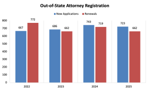 Out-of-State Attorney Registration. In 2025, the Office of the General Counsel processed 723 new applications and 662 renewal applications submitted by out-of-state attorneys registering to participate in a proceeding before an Oklahoma Court or Tribunal. Out-of-State attorneys appearing pro bono to represent criminal indigent defendants, or on behalf of persons who otherwise would qualify for representation under the guidelines of the Legal Services Corporation due to their incomes, may request a waiver of the application fee from the Oklahoma Bar Association. Certificates of Compliance are issued after confirmation of the application information, the applicant’s good standing in his/her licensing jurisdiction and payment of applicable fees. All obtained and verified information is submitted to the Oklahoma Court or Tribunal as an exhibit to a “Motion to Associate.”
