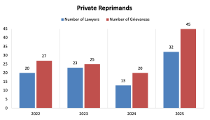 Private Reprimands. Pursuant to Rule 5.3(c), RGDP, the Professional Responsibility Commission has the authority to impose private reprimands, with the consent of the lawyer, in matters of less serious misconduct or if mitigating factors reduce the sanction to be imposed. During 2025, the Commission administered private reprimands to 32 lawyers involving 45 formal grievances.
