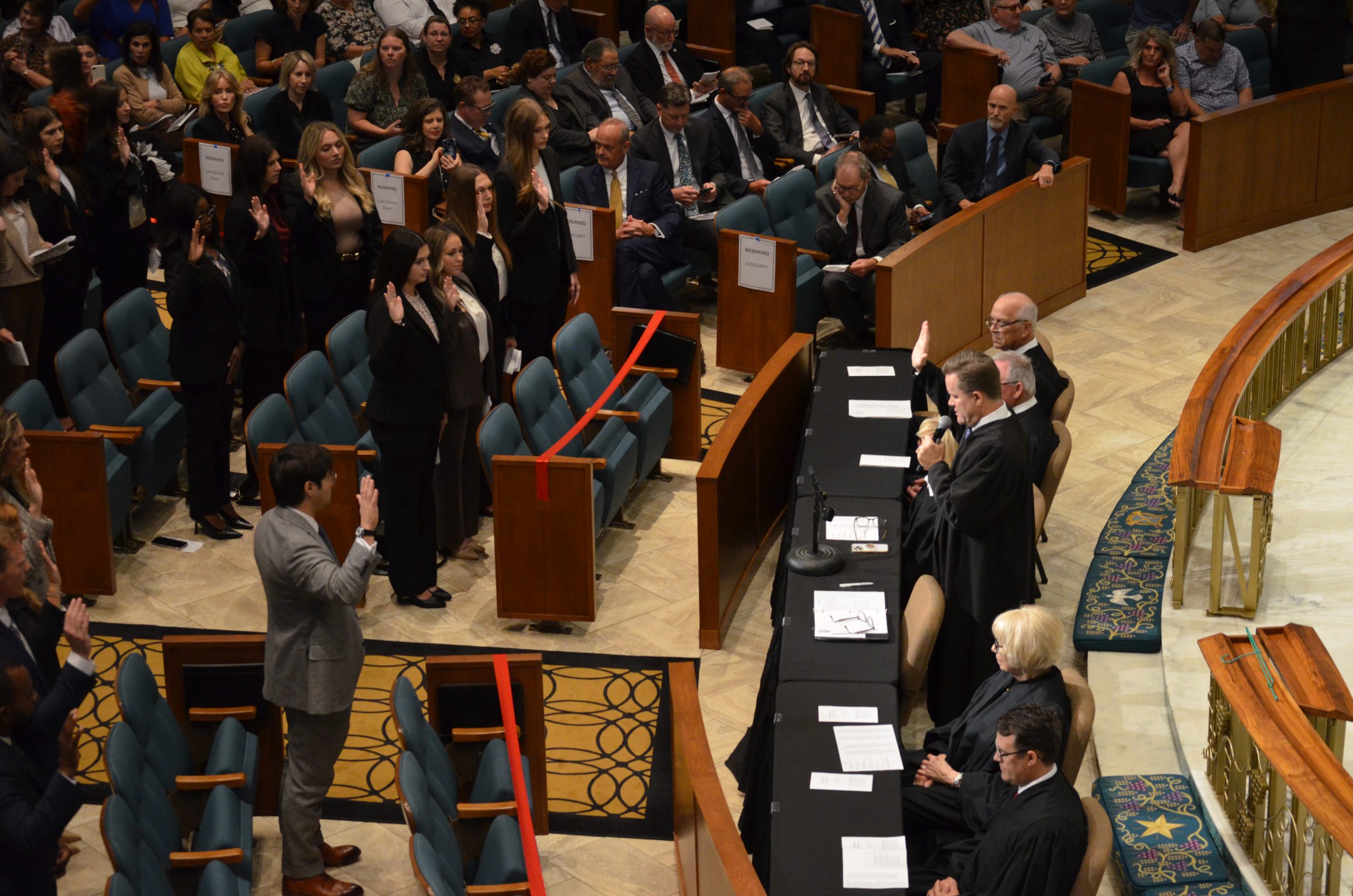 Board of Bar Examiners Chairperson J. Roger Rinehart announces that 271 applicants who took the Oklahoma Bar Examination on July 29-30 were admitted to the Oklahoma Bar Association on Thursday, Oct. 2, or by proxy at a later date. Oklahoma Supreme Court Chief Justice Dustin P. Rowe administered the Oath of Attorney to the candidates at a swearing-in ceremony at St. Luke’s Methodist Church in Oklahoma City. A total of 362 applicants took the examination.